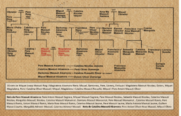 Els besavis Massutí Alzamora: Miquel Josep Massutí Roig (1856 – 1931) i Magdalena Alzamora Riera (1864 – 1935) visqueren els darrers anys del regnat d’Isabel II, la revolució de 1868, l’intent de monarquia parlamentària d’Amadeu de Savoia (1871-1873), la Primera República (1873-1874), la tercera guerra carlina (1872-1876) i la restauració borbònica.