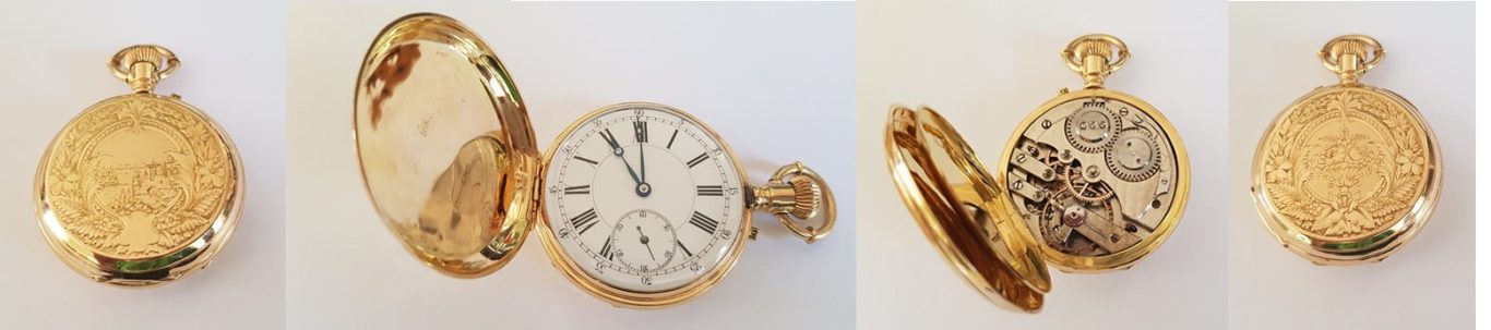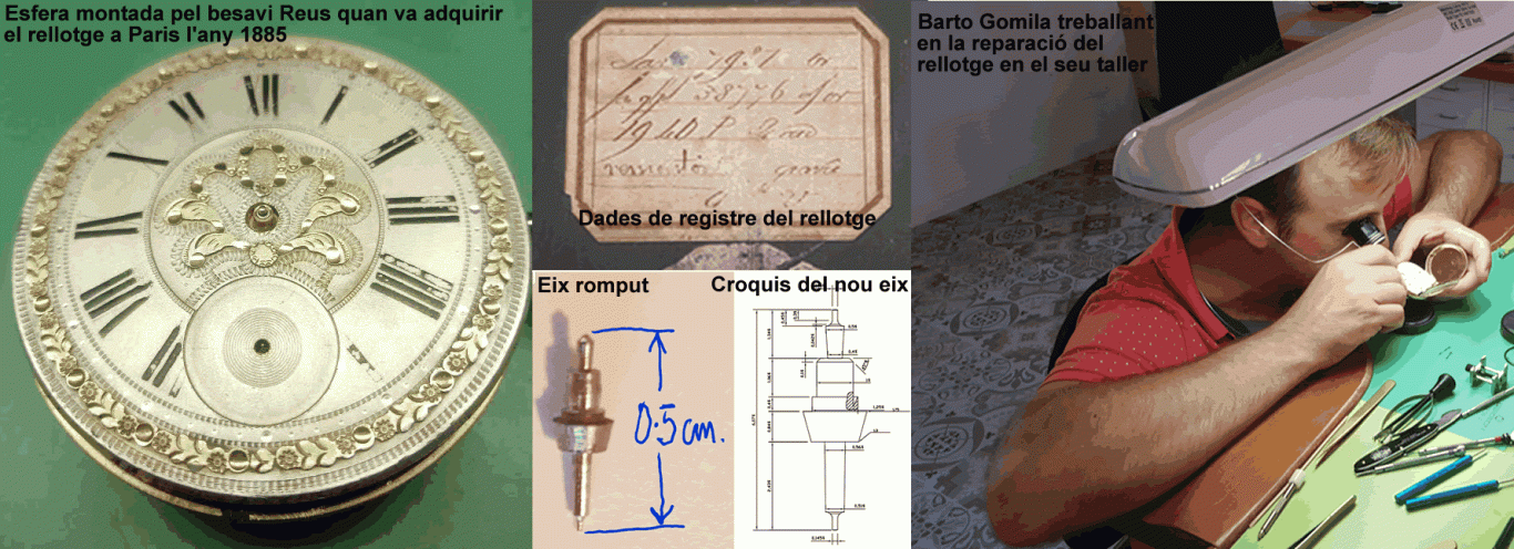 Com ja s’ha dit, el meu padrí el me va regalar i a mi m’encantava jugar amb ell. Quan encara no havia fet els 10 anys vaig patir una hepatitis que me va fer estar dins es llit mes d’un mes. Per passar el temps jo volia jugar amb el rellotge i ma mare no sabia dir-me que no. En una d’aquelles ocasions el rellotge me va caure se va rompre es vidre i va deixar de funcionar. El vaig dur a molts de rellotgers, un d’ells de Barcelona prop de via Laietana que m’havien dit que era el millor, però tots me digueren que no tenia arreglo que tenia romput l’eix del volant i que per aquests rellotges tan antics no hi havia recanvis. Però un dia parlant amb una amiga marxant d’art de Barcelona li vaig comentar el fet i me va dir que ella coneixia qui segurament el me podria arreglar. Lo mes sorprenent va ser que quan me va donar l’adreça del rellotger va resultar que tenia el taller en el carrer d’es porrassar vell d’Alaior a Menorca, el mateix carrer de la casa dels meus sogres a on feim llargues estades cada any. El rellotger, en Barto Gomila va resultar ser el nostre veïnat . Tant aviat com vaig entrar en el taller http://tallerdeltemps.es, en Barto me va dir que si, que tot i que duria molta feina, el rellotge tornaria funcionar. Me va explicar que aquest tipus de rellotges, un rellotge de butxaca tipus sabonet, havia representat un dels principals avenços tecnològics del segle XIX, perquè reduïren la maquinaria lo qual els feia portables aconseguiren fer-los mes precisos i regulars i així se va iniciar la producció en massa de rellotges suïssos a finals del segle XIX