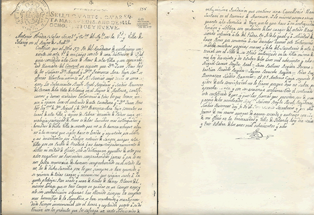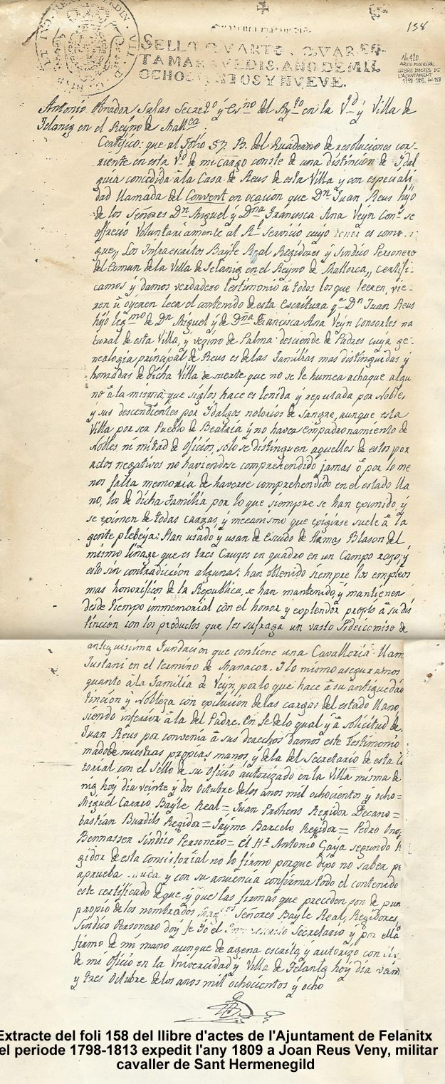 Apart de tot això, hi ha quatre objectes, tres referencies materials, que me connecten amb el besavi Reus: el primer, un quadre d’un vaixell, el vapor Santueri; el segon, el regal que me va fer ma mare quan me vaig llicenciar en ciències biològiques a la Universitat Complutense l’any 1973, 56 volums de la Histoire Naturel del compte de Buffon, el tercer el regal que el meu padrí de fons Miquel Reus Manzanares me va fer el dia que me batiaren a la església de Sant Miquel de Felanitx, un preciós rellotge de butxaca i el quart un certificat de 1809, extracte del foli 158 del llibre d’actes de l’Ajuntament de Felanitx del període 1798-1813.