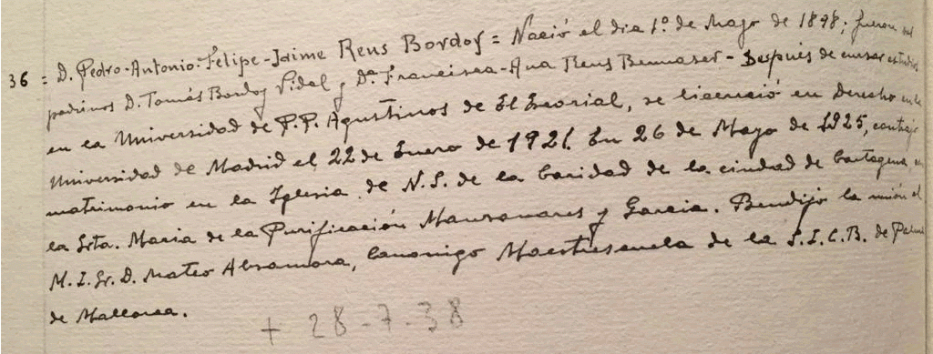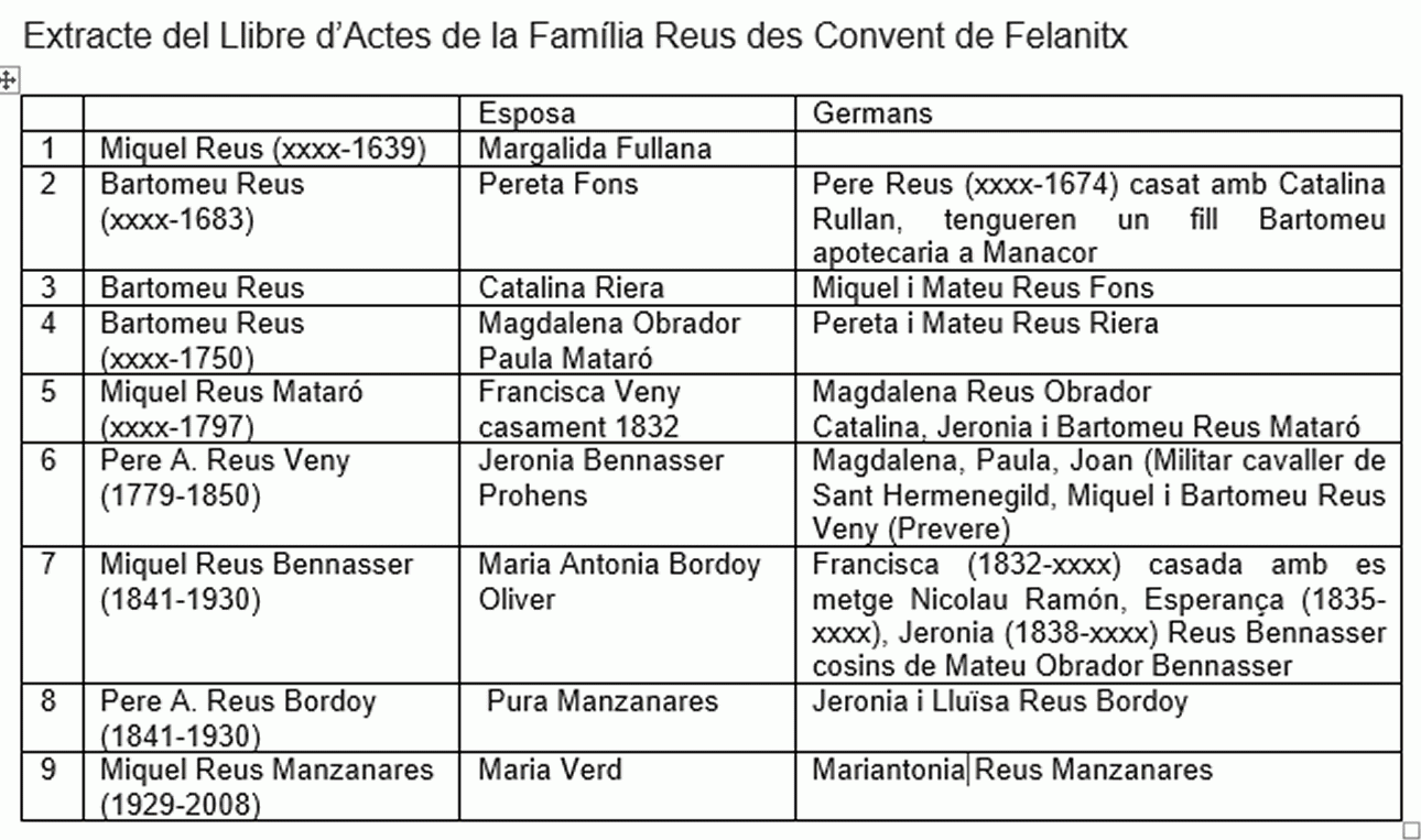 Extracte del llibre d’actes de la família Reus des Convent de Felanitx