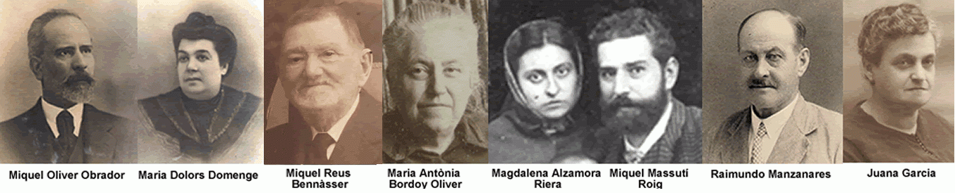 El meus besavis son Miquel Oliver Obrador (1861-1930c) i Maria Dolors Domenge (1863-1911); Miquel Reus Bennàsser (1841 – 1930c) i Maria Antònia Bordoy Oliver (1875 – 1925c); Miquel Josep Massutí Roig (1856 – 1931) i Magdalena Alzamora Riera (1864 - 1935) i Raimundo Manzanares (1851 – 1929) i Juana Garcia (xxxx – 1958c).