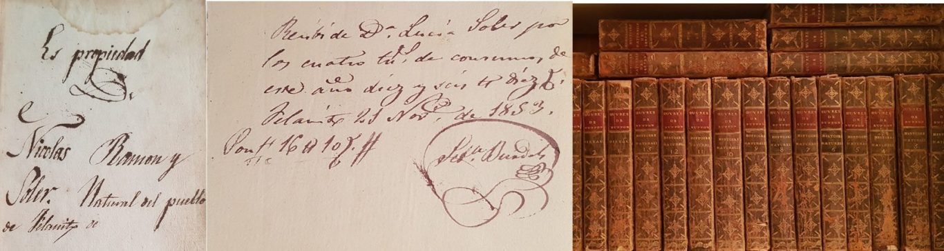 El com l’Histoire Naturel del compte de Buffon va arribar a les meves mans també te la seva historia. Es metge Nicolau Ramon Soler era el cunyat del besavi Reus. Estava casat amb Francisca Reus Bennàsser i va estudiar medicina a França en el moment en que Claude Bernard ensenyava les seves teories sobre la medicina experimental, origen de la medicina actual. Per Bernard l’anatomia comparada era un element important en el seu estudi del cos humà. Per això es lògic que Nicolau Ramon adquirís l’obra publicada per Buffon cent anys abans. En el primer tom vaig trobar, a mes de la certificació de la propietat dels llibres, el rebut de compra a nom de Lluïsa Soler la seva mare. Nicolau Ramón Soler i la seva esposa Francisca Reus Bennàsser, moriren sense descendència i es així com aquests llibres arribaren a la biblioteca de can Reus des Convent. Passaren el anys i en torn a 1945, l’avi Pere A. Reus havia estat condemnat a mort en un ignominiós judici absent de tota garantia legal i afusellat en definitiva per la seva fidelitat a la constitució democràtica per l’exercit sollevat. La seva esposa, la abuelita Pura Manzanares, també havia estat condemnada a mort, commutada aquesta pena per cadena perpetua i finalment alliberada. La família intentava sobreviure i pagar les quantioses multes de responsabilitats polítiques que li havien imposat amb tots el bens incautats però semblava que la tempesta començava a escampar. En aquell temps mon pare Miquel Oliver Massuti havia estat alliberat d’els camps de treballs forçats en que l’havien empresonat l’estiu de 1936 sense cap motiu documentat. Mon pare ja festejava a ma mare i estudiava Ciències naturals a la Universitat de Barcelona. El cas es que arribaren noticies a Can Reus de que els falangistes, segurament no satisfets amb tot el mal que havien infringit a aquella família de be, volien fer un registre de la casa per cercar motius que permetessin obrir noves causes penals. Pura Manzares ho va tenir clar, de cap manera volia tornar passar per l'infern que havia passat. Ens ho han pres tot va dir, si han de trobar algun motiu que els hi pugui servir ha de ser a la biblioteca, i decidirem cremar-ho tot. Uns amb sa guillotina de s’impremta, a on l’avi Reus havia imprès el primer diari en català de la part forana, tallaven els lloms del llibres i altres feien foc. Ma mare estava en el primer grup i quan arriba a les seves mans la Histoire Naturel del compte de Buffon i va voure els magnífics dibuixos d’animals va dir, això serà per en Miquel i ho va deixar de banda. Poca cosa però gracies a ma mare alguna cosa se va salvar d’aquella biblioteca i de la barbaria enemiga de la cultura, de la justícia i de la llibertat que tant de mal va fer en el nostre poble.